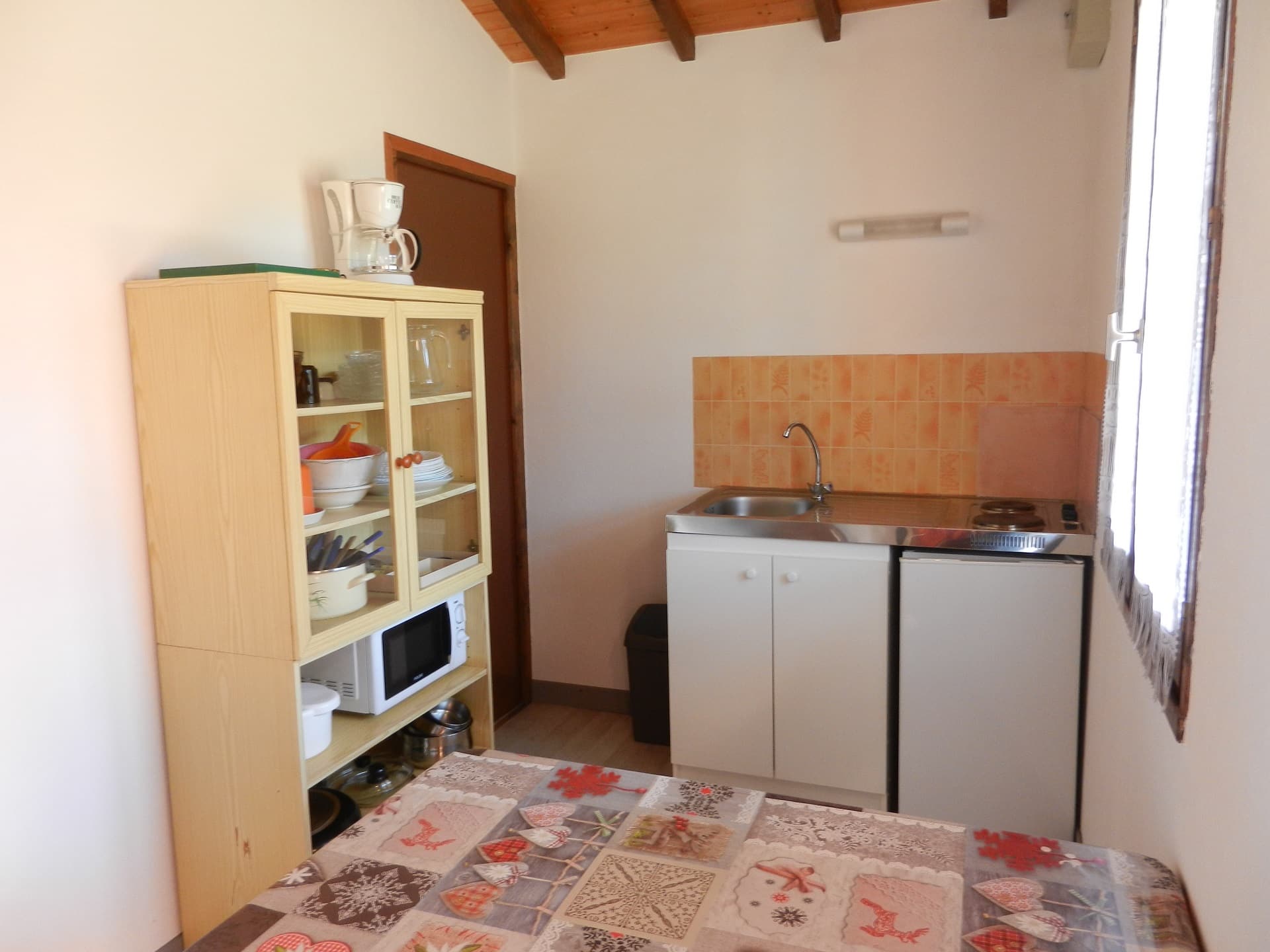 Petit chalet atypique en bois avec belle terrasse couverte. 3 lits. Arrivée entre 15 h et 19 h. Départ entre 08 h et 10 h. Sans TV.